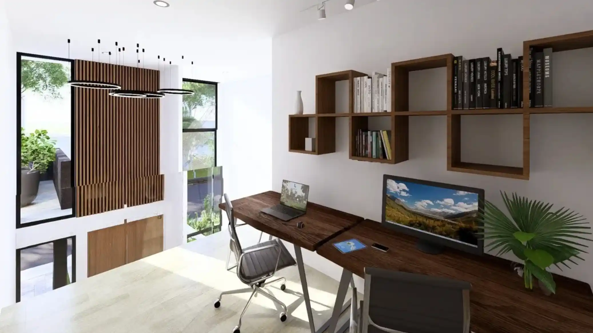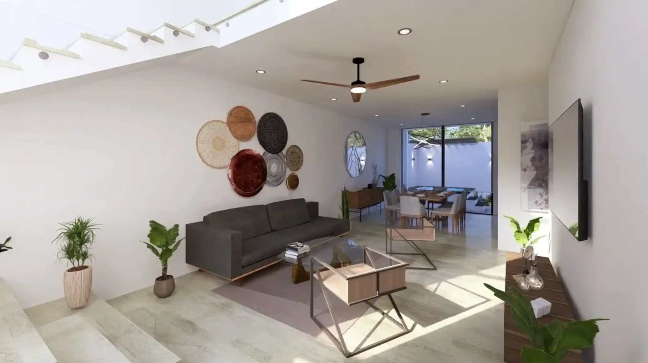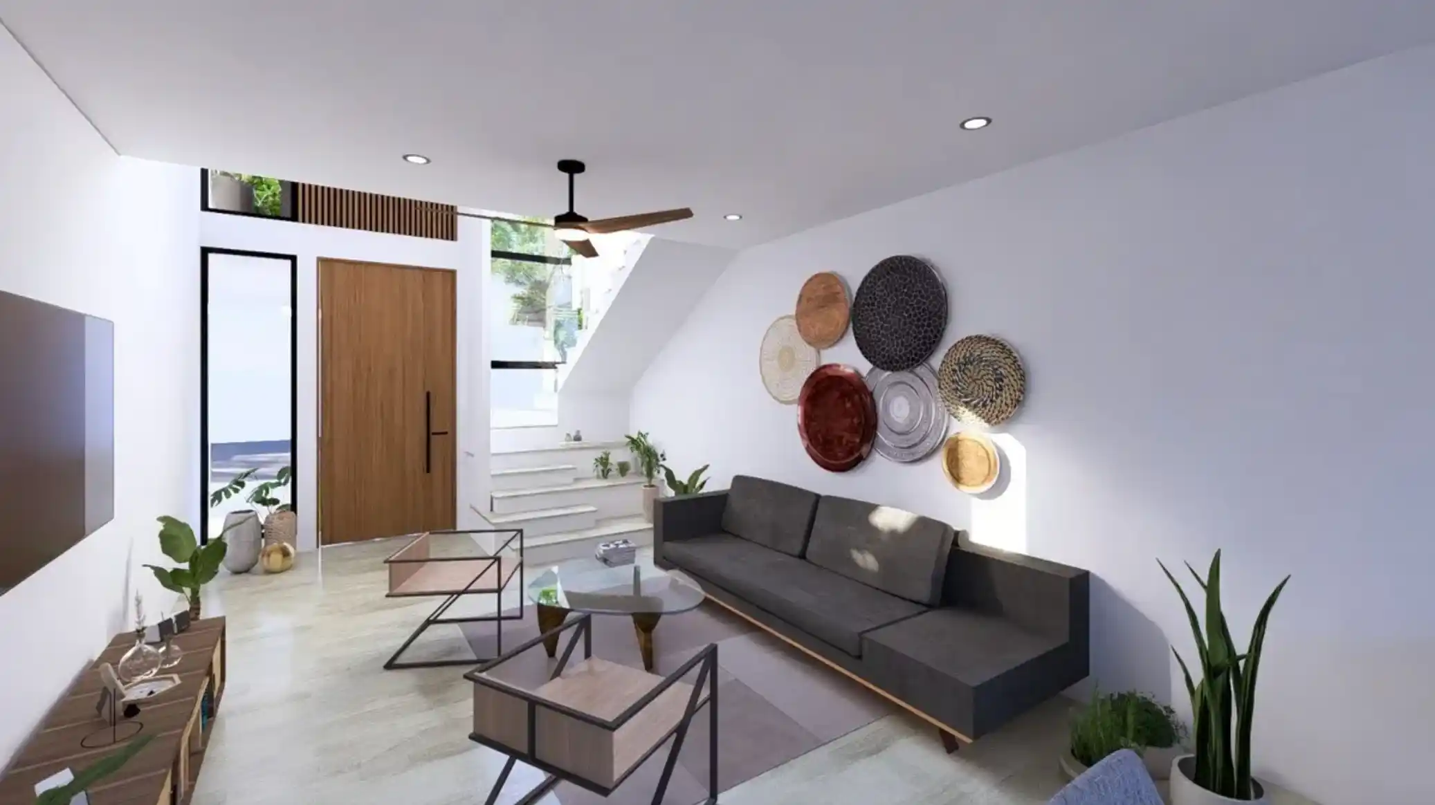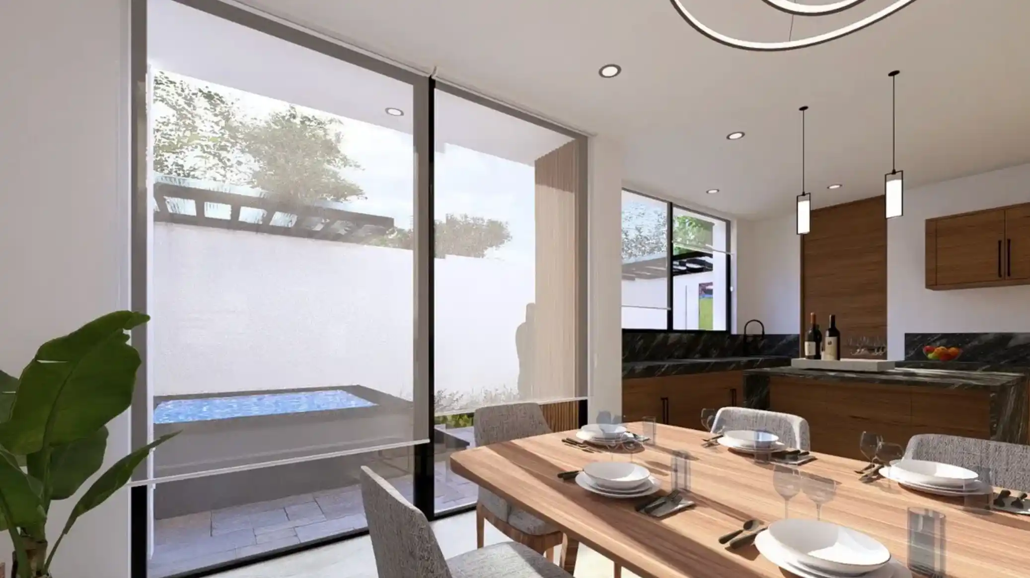 Características: Diseño con doble altura en acceso, altura interior de 2.80 en ambas plantas, pisos de porcelanato, mesetas de granito, cancelería de aluminio premium, preparación eléctrica e hidráulica de alta calidad, cocina equipada.